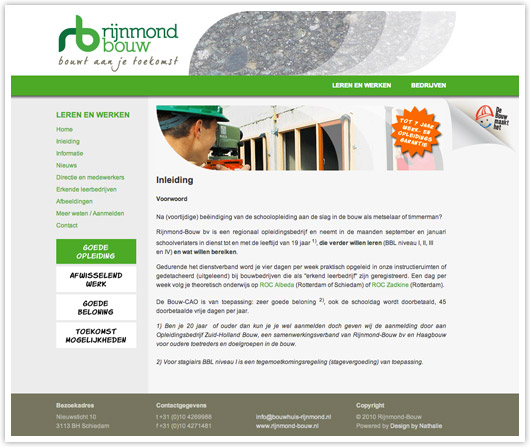 Dankzij het eigentijdse en professionele herontwerp van Nathalie voor de huisstijl van Rijnmond Bouw worden de communicatie doelstellingen nu goed ondersteund. Door het gebruik van fris groen binnen de huisstijl en de toevoeging van een verhelderende punchline onder het logo wordt het nieuwe Rijnmond Bouw nu goed vertegenwoordigd. Samen met Nathalie hebben we gewerkt aan een nieuwe frisse uitstraling. En dat mocht ook wel na ruim 30 jaar teren op "het oude vertrouwde". Rijnmond-Bouw (bouwopleidingen en detachering) is een bedrijf voor jonge aankomende vakmensen in de bouw en dat mag je anno 2014 best uitstralen. Nathalie heeft dat uitstekend aangevoeld en ons een mooi nieuw gezicht gegeven." Wolf van Pelt, directeur Rijnmond Bouw |